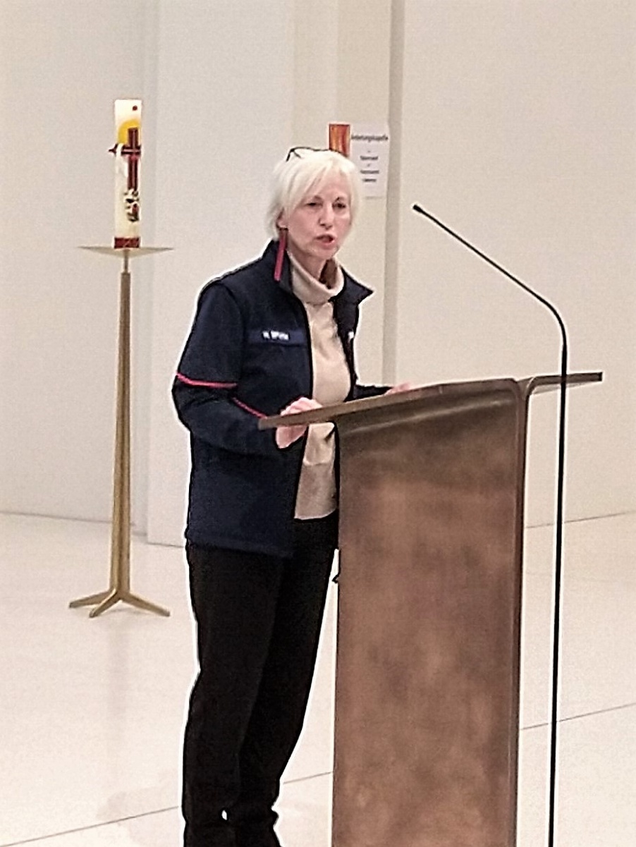Die Koordinatorin der Hospizarbeit, Monika Spath, erzählte mit eindrücklichen, ja auch ergreifenden Worten, von Ihrer Tätigkeit und berichtete über die Aufgaben und Herausforderungen aller in diesen Dienst eingebundenen ehrenamtlichen Mitarbeiter. Ganzheitliche Begleitung Schwerstkranker, Sterbender und alter Menschen in deren letzter Lebensphase, Betreuung Angehöriger, auch über den Tod hinaus, Beratung und Beistand, auch für Kinder und Jugendliche, stellen nur einen Teil des Angebotes der Organisation dar. Frau Spath nimmt in Ihrer Ansprache immer wieder Bezug auf die Lesung aus dem Buch Jesus Sirach und sie schildert, wie wir im Sinne der Nächstenliebe Trauernden begegnen können. „Zuhören – sich nicht wegducken, nicht die Straßenseite wechseln und auch Sprachlosigkeit aushalten“. Wertvolle Impulse, die die Gottesdienstbesucher mit nach Hause nehmen konnten.