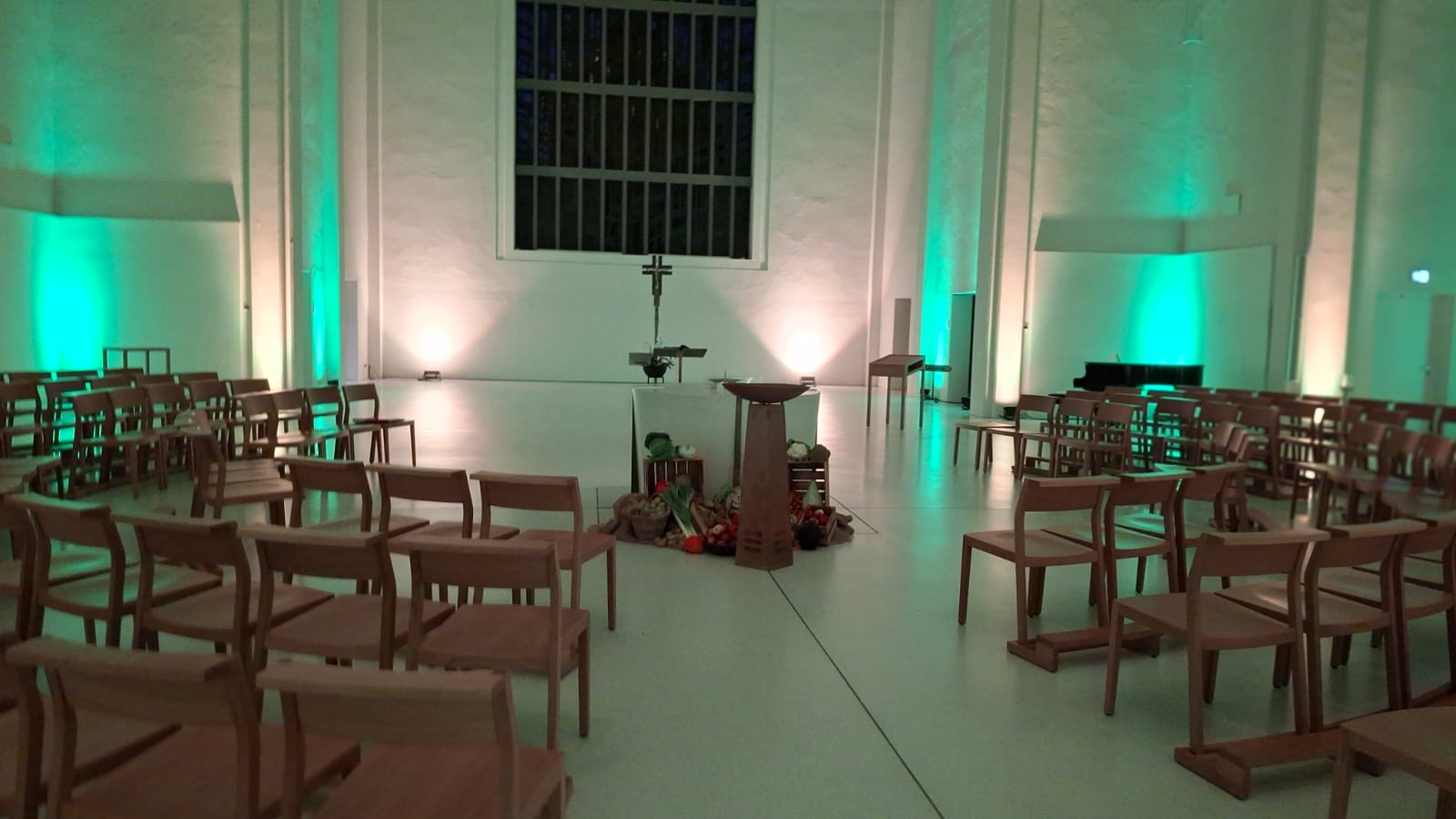Umrahmt und optisch einmalig gestaltet wurde der gesamte Gottesdienst von einer Illumination des CaSa-Vielfalt in türkis und gelb, die im Rahmen einer großen Fortbildung für Gottesdienstbeauftragte die Kirche und das Foyer in ein besonderes Licht tauchte.