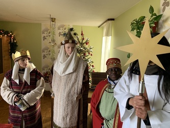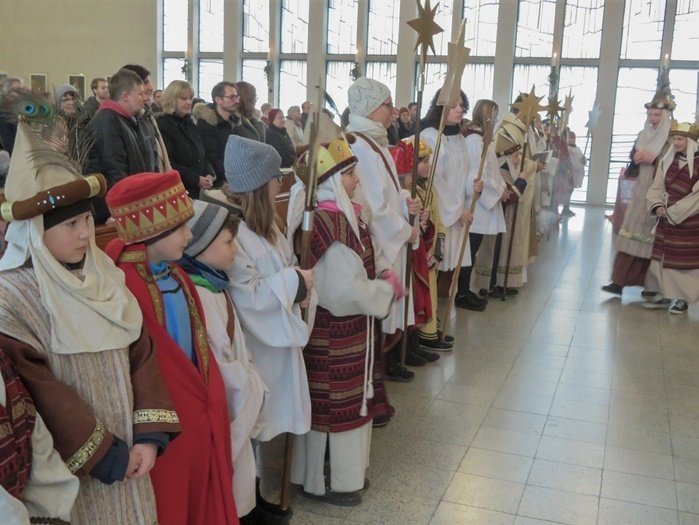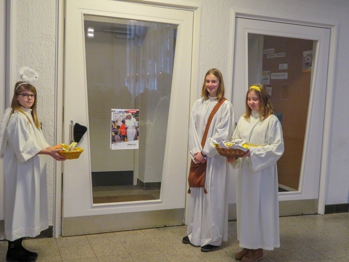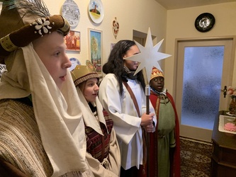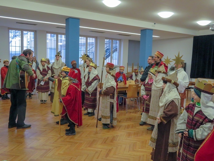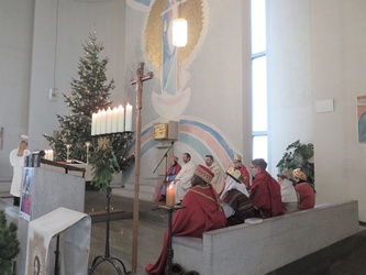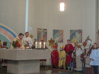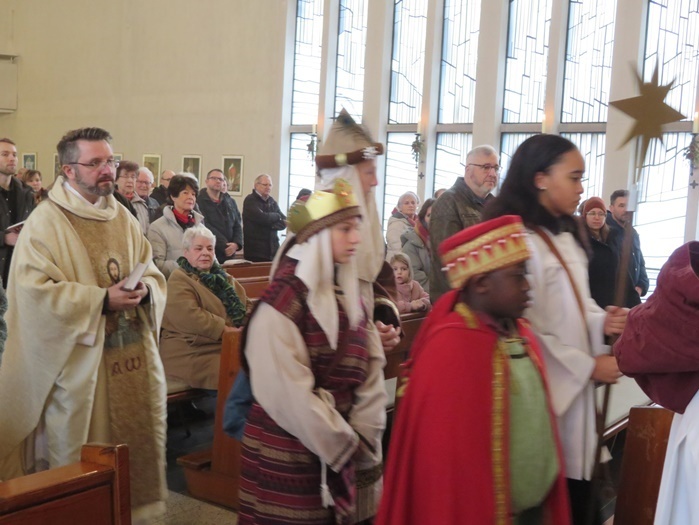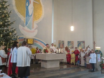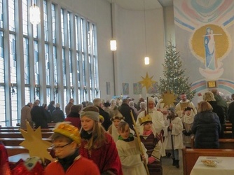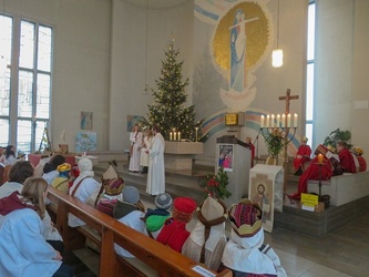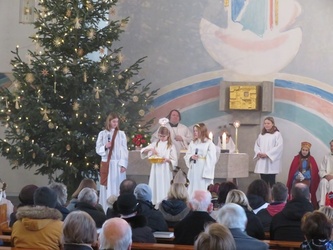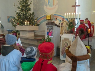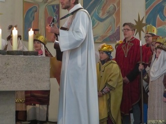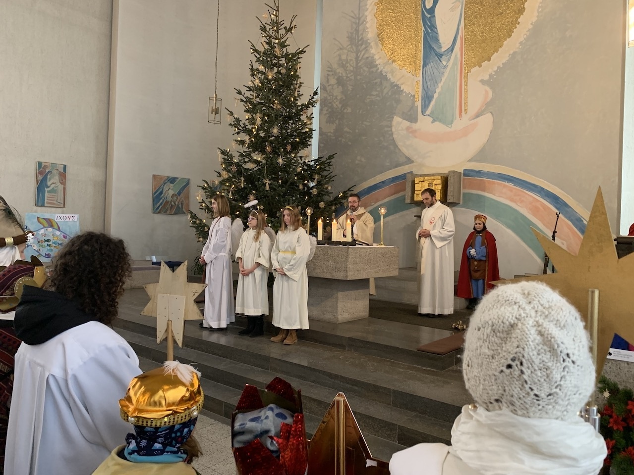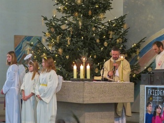 Die Friedensbotschaft stand auch im Mittelpunkt des feierlichen Gottesdienstes der in Maria Hilf unter der Leitung von Pfarrvikar Uwe Schüller und Diakon Joachim Werb gefeiert wurde. Die Anwesenheit so vieler Königinnen und Könige - wiederum prächtig ausstaffiert vom Gewänderteam aus Maria Hilf (Frau Horsch, Frau Hub, Frau Köhler) - wurde noch getoppt von drei Friedensengeln (Emma Beiergrößlein, Philpppa Werner und Annika Ludwig), die ihre Vorstellung eines relgionsübergreifenden Friedens den Kindern und sonstigen Gottesdienstteilnehmern nahe brachten. Aus Schwerter sollen Pflugscharen werden, so der biblische Auftrag, den sie in selbstgebastelten Friedenstauben handgreiflich den Gottesdienstbesuchern am Ende mitgeben konnten. Man kann jedes schlimme Wort in ein gutes Wort verwandeln, so der eine (muslimische) Engel, der im Gleichklang mit dem christlichen und jüdischen Himmelsboten ans Werk ging.