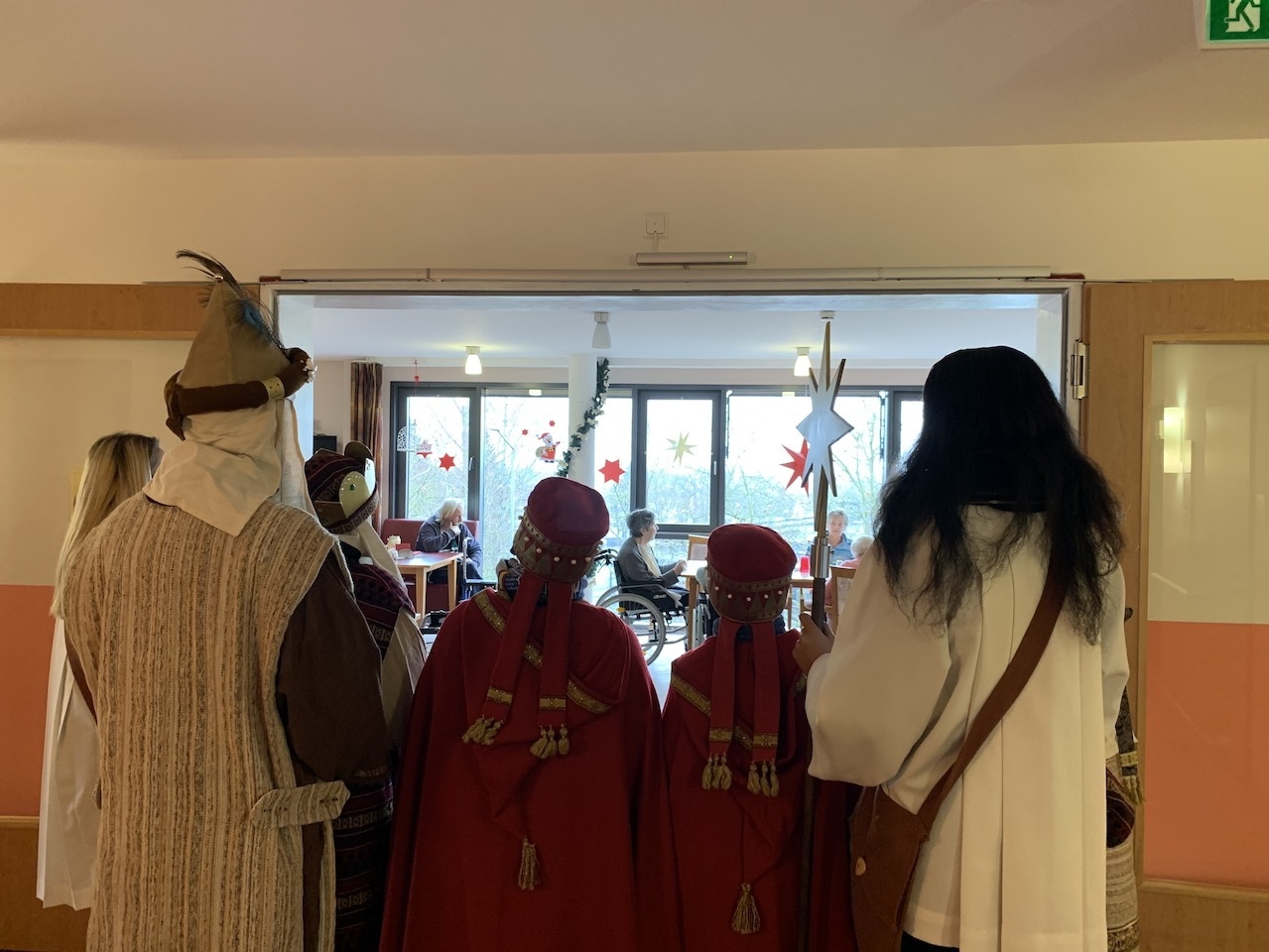 In seiner Predigt sprang Diakon Werb mitten hinein in das Thema. Er begann: „Liebe Königinnen und Könige, liebe Schwestern und Brüder, liebe Friedensengel, eigentlich wären ja heute die Heiligen Drei Könige – oder die Weisen aus dem Morgenland, also das Land zwischen Eufrat und Tigris das große Thema. Aber schon allein beim Blick auf deren Herkunft: irgend ein Land am persischen Golf, vielleicht Irak oder Iran, lässt einen doch das Lächeln über den Anmarsch der heiligen Drei im Gesicht gefrieren. Schwerter statt Pflugscharen werden dort im Moment gezückt. Da machen wir uns nichts vor und ich möchte nicht außenrum reden, Donald Trump schlägt mit den selben Waffen zu, deren Bekämpfung er eigentlich vorgibt. Terrorismus, Überfall, Tod und Vernichtung ohne Rücksicht auf die Gefährdung des weltweiten Friedens im Land der Heiligen Drei. Wenn ich könnte würde ich euch drei Friedensengel zusammen mit drei heiligen Königen zu ihm und alle an diesem terroristischen Spiel Beteiligten schicken, damit sie ihre Schwerter zu Pflugscharen umwandeln und es schaffen, ihre mächtigen Knie vor dem Kind in der Krippe zu beugen, so wie es die drei wirklich weisen Menschen damals getan haben. Sie haben nämlich begriffen, worin die dreifältige Weisheit des Lebens, ja Überlebens besteht. Frieden, ein Leben unter König Jesus und Achtung vor dem Glauben anderer“. Einige Sätze weiter: „Erinnnern wir uns nochmal an unsere drei Friedensengel. Unter den Flügeln ihrer Friedenstauben war der ganz normale Alltag versteckt mit seinen oft kleinen, aber sehr wirksamen Schwertern des Unfriedens“.