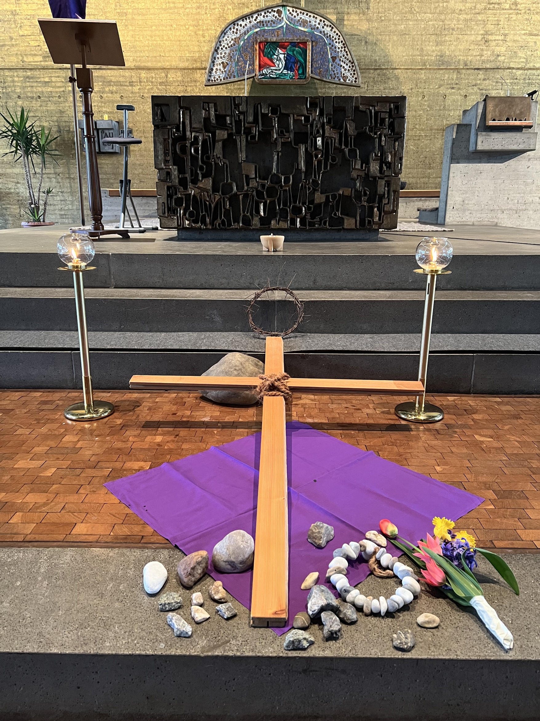 Um 15.00 Uhr fand dann in der Kirche die eindrucksvolle Karfreitagsliturgie statt. Gottesdienstbeauftragte Anja Mantel hatte den Passionstext in einer freieren Variante vorbereitet, die durch Impulse zum Nachdenken die Gottesdienstteilnehmenden mit in das Geschehen hinein nahmen. Zur Kreuzverehrung legten die Gläubigen neben Blumen auch einen Stein ab für alle Last und Not im eigenen Leben und auf der ganzen Welt.