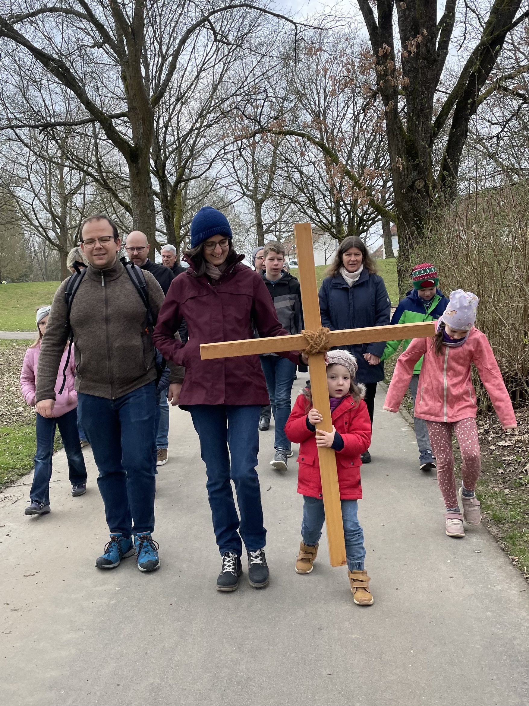 Um 10.00 Uhr startete dann der Familienkreuzweg am Deutschfeldfriedhof. Durch den Seinäjoki-Park machte sich die Gruppe auf, um an einzelnen Stationen Jesu Kreuzweg zu gedenken. In diesem Jahr stellte Pastoralreferentin Maria Garsky Begegnungen Jesus mit veschiedenen Personen in den Mittelpunkt der Betrachtungen. Mit passenden Gesten konnten die Teilnehmenden der Bezug zum eigenen Leben erspüren. So half Simon von Zyrene Jesus das schwere Kreuz zu tragen. Beim gegenseitigen Untergehaken, dachten alle darüber nach, wo ihnen selbst schon geholfen wurde bzw. wo sie einer anderen Person geholfen haben. Bei der Verspottung Jesu durch die Soldaten, zeigten alle mit dem Finger auf sich selbst und überlegten, wo sie selbst schon Spott oder Mobbing erlebt haben. Aber Jesus wurde von Frauen und seiner Mutter auf seinem letzten Weg begleitet. Deshalb umarmten sich die Familien gegenseitig zum Zeichen, dass auch sie nie alleine gelassen werden. Zum Abschluss streckten alle ihre Hände nach oben in den Himmel, um ihren Glauben an die Auferstehung bei Gott zu zeigen.