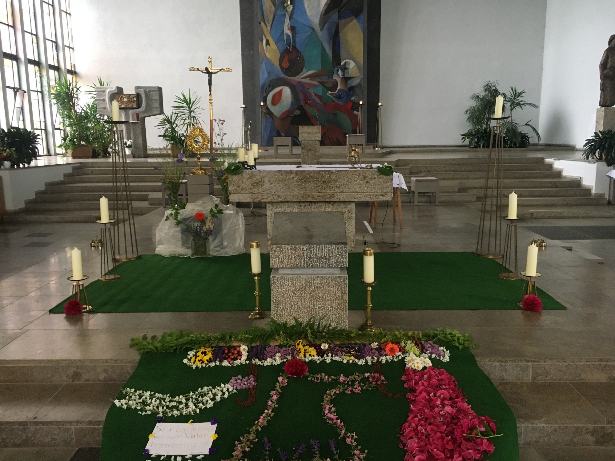 Entsprechend der Tradition feiert die Gemeinde St. Josef "Ihr" Fronleichnam am Sonntag nach Fronleichnam. Seit gut zwanzig Jahren gibt es außer der Prozession auch wieder einen Blumenteppich. Dieses Jahr Indoor in der Kirche statt Outdoor, anstelle des Pfarrfestes gibt es Bratwurst to Go.