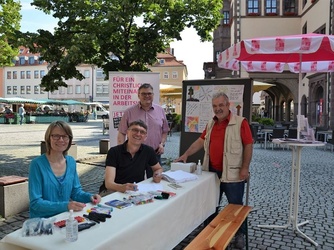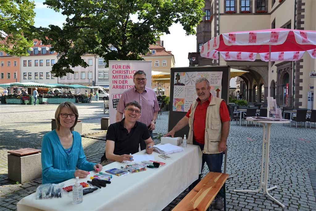 KAB Mitglied Ulrike Pfrang setzt sich seit vielen Jahren für den Sonntagsschutz ein. „Wir brauchen diesen staatlich verordneten Ruhetag und zwar genau so, wie er ursprünglich gedacht war. Es wird nur in den gesellschaftlich unbedingt notwendigen Bereichen wie Gesundheit und Sicherheit und Allgemeinwohl (z. B. Kultur) gearbeitet. Das sollte noch besser gewürdigt werden. Außerdem ist der Sonntag der Tag für soziale Kontakte in Familie und Gesellschaft. “ erklärte Ulrike Pfrang am Aktionsstand.