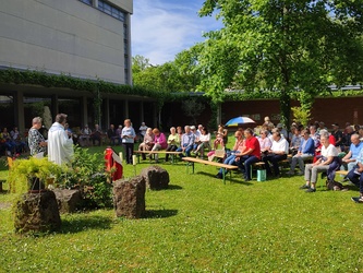 Bei strahlendem Sonnenschein konnte Pfarrvikar Uwe Schüller eine stattliche Anzahl an Gästen im Innenhof von St. Michael zur Maiandacht begrüßen.