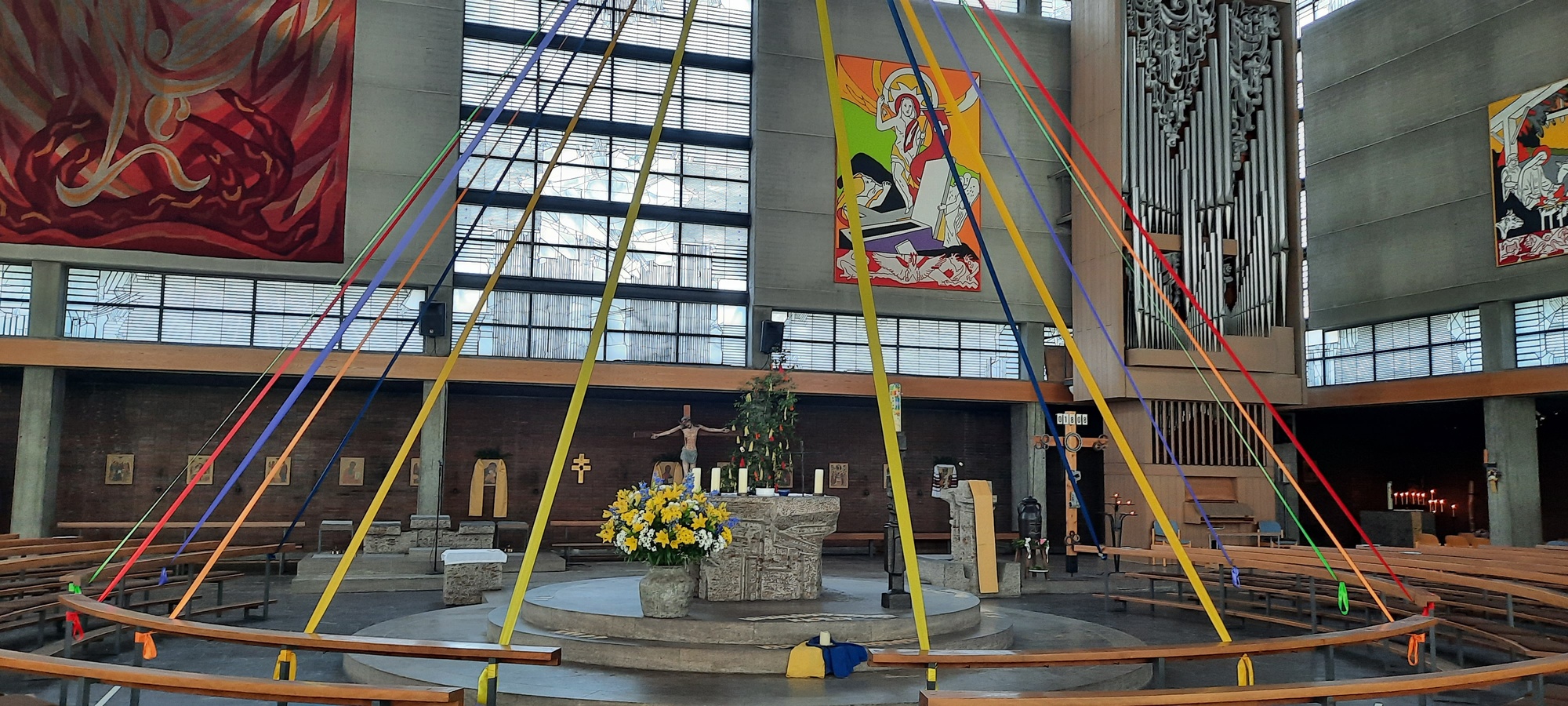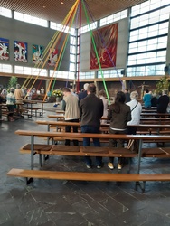 In lockerer Atmosphäre gab es rege Unterhaltungen und Gedankenaustausch. Die schön geschmückte Kirche mit dem neuen Regenbogen über dem Altar und den 7 geschmückten Birken, die in diesem Jahr symbolisch für die „Schöpfungsgeschichte stehen, trug zusätzlich zu einer fröhlichen und gelösten Stimmung bei. Man konnte wieder einmal spüren, dass Kirche als Ort der Gemeinde und der Gemeinschaft erlebt und gelebt werden kann.