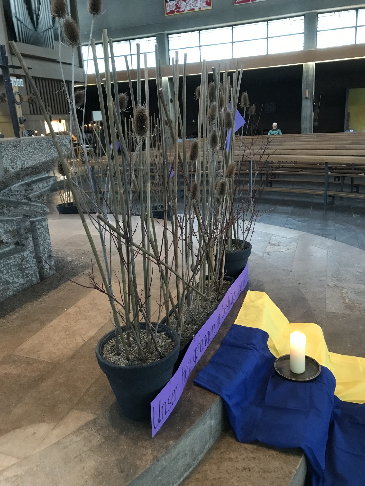 Die Gemeinde St. Michael hat sich für die diesjährige Fastenzeit überlegt, wie das Verhüllen und Verdecken der Altäre bzw. des Altares noch unterstrichen werden könnte. Die Installation aus Gestrüpp, Bambusrohren, Disteln und Dornen soll deshalb nicht nur den Blumenschmuck ersetzen, sondern ein stückweit wie eine Heckenwand den Altar verdecken. Jedoch soll es nicht bei einer starren und sich nicht verändernden Hecke bleiben. Jeder, der nach St. Michael kommt, wird eingeladen, auf violetten Kärtchen, die am Eingang ausliegen, Ängste, Sorgen, Zweifel, Klagen und Befürchtungen, aber auch Bitten, Fürbitten und Sehnsüchte aufzuschreiben und zwischen oder an das Gestrüpp zu hängen.