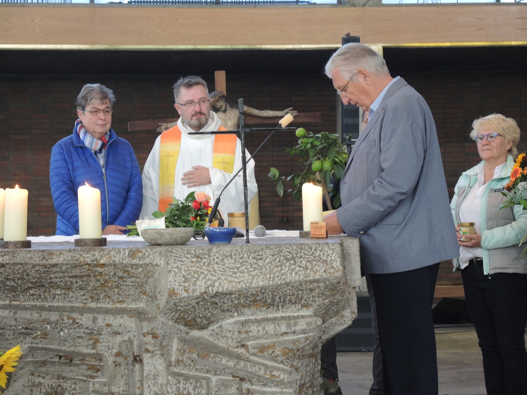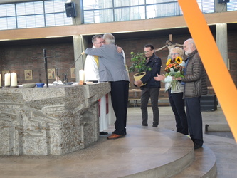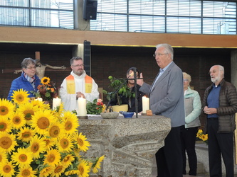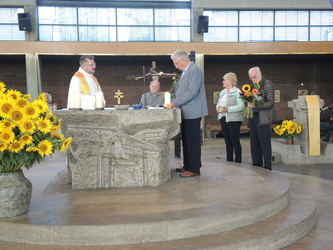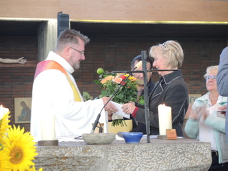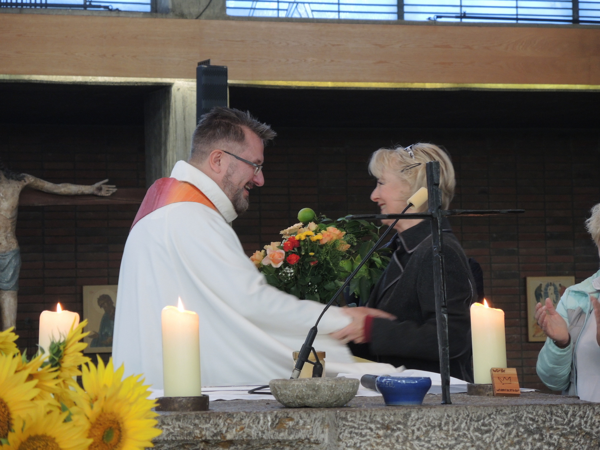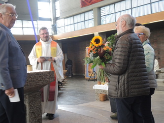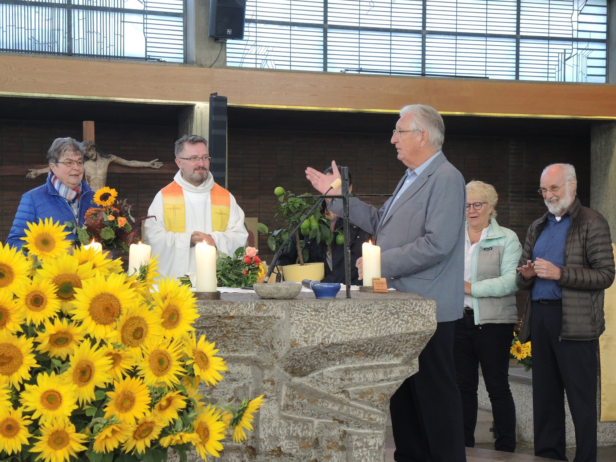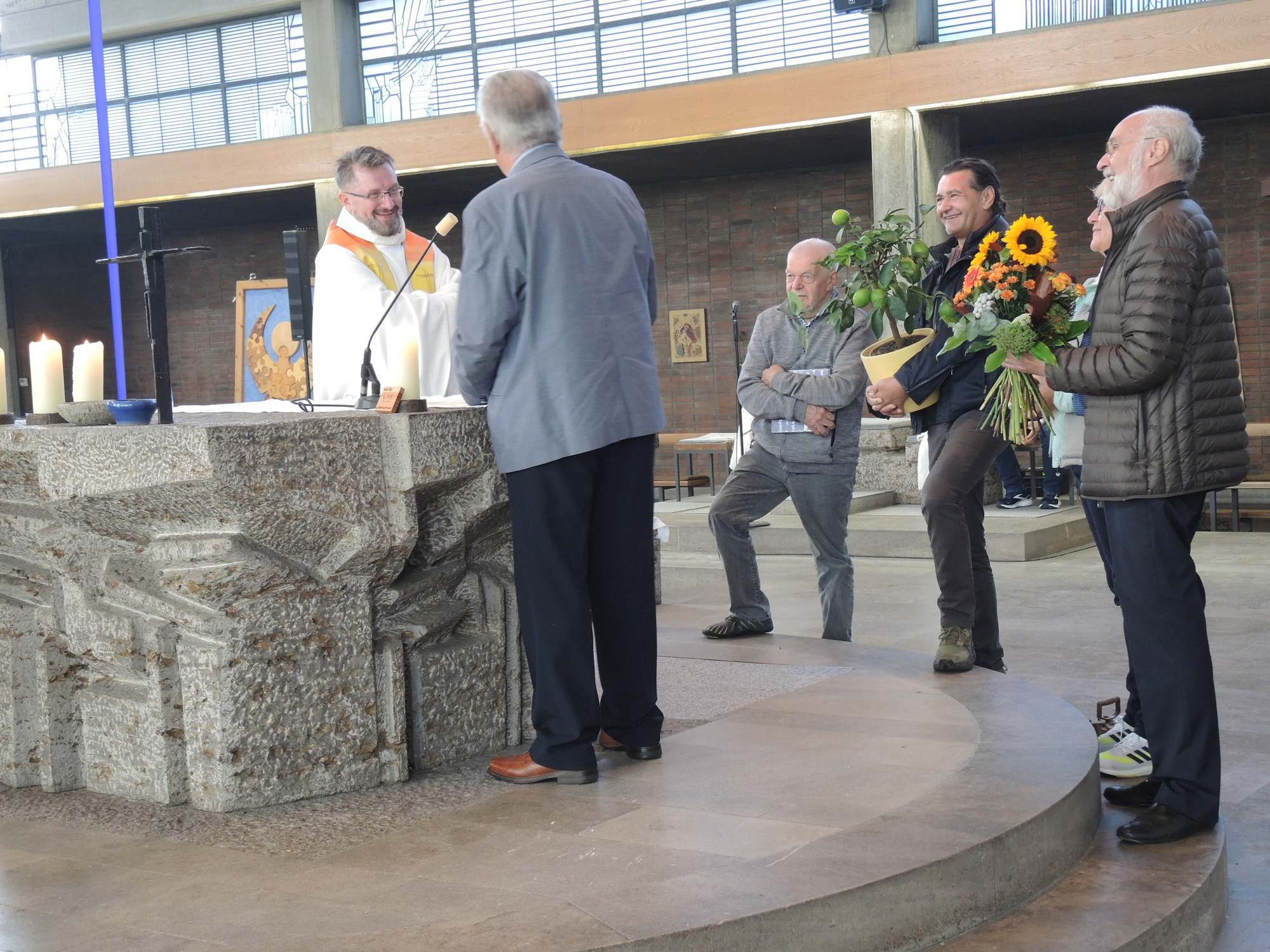 Nach dem Gottesdienst bedankte sich Kirchenpfleger Dieter Rückert bei ihm für die gedeihliche Zusammenarbeit. "Uwe, du hast in unserer Pfarrgemeinde Spuren hinterlassen!" Als Erinnerung überreichte die Kirchenverwaltung ein Zitronenbäumchen. Seitens der Michaelswerkstatt und auch aus persönlichen Gründen bedankte sich Monika Brünner mit einem Blumenstrauß bei ihm.