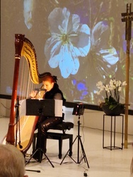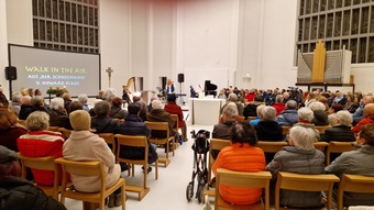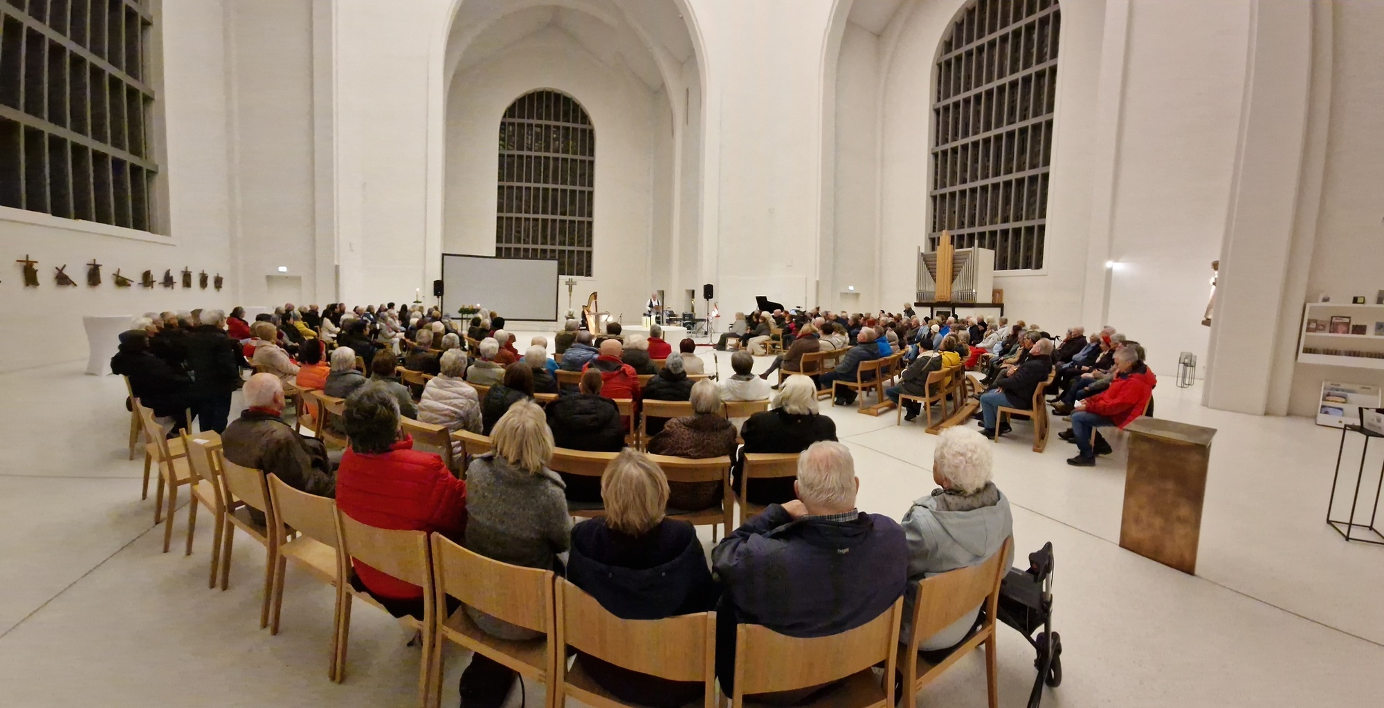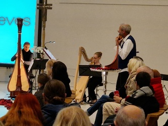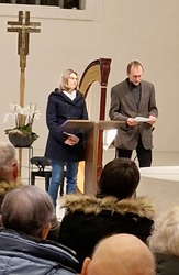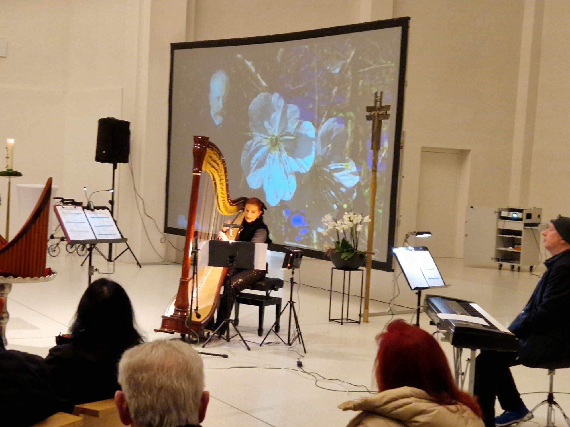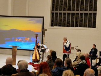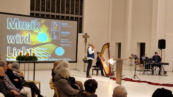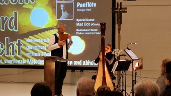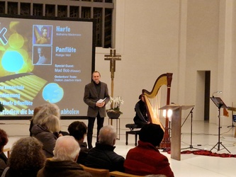 Nathalino Maldonado (Harfe), Rüdiger Wolf (Panflöten) und Mad Bob Thomas Bickel (Keybords) gaben das kleine Adventslicht des am Anfang von Diakon Joachim Werb gesegneten Adventskranzes musikalisch auf höchstem Niveau weiter. Die Einstimmung in den Advent als spirituelles Angebot erreichte durch die zahlreichen musikalischen Interpretationen und eigenständigen Bearbeitungen der Künstler immer wieder die Herzen der Menschen. Egal ob vertraute Melodien traditioneller Werke, Themen aus Film- und Leinwandproduktionen oder kreative Bearbeitung aktuellen Liedgutes, stets war der Zauber und die Besonderheit der einmaligen Kombination der drei musikalischen Welten wahrnehmbar. Für ein emotionales Highlight sorgte der erstmalige öffentliche Auftritt von Mike, die mit ihrer Lehrerin an der Harfe gekonnt das "grünen Kleid" der "Greensleeves" zu tragen wusste. Weitere absolute Höhepunkte stellten die jeweiligen Solobeiträge der drei Musiker dar. Für nachdenkliche und adventliche Momente im Kirchenraum sorgten die knappen intensiven Impulse von Eva-Maria Öttinger und Diakon Joachim Werb. In dieser Verbindung lag der besondere Reiz und Charme dieses gottesdienstlichen Angebots, jenseits gewohnter Gottesdienstformen. St. Anton erwies sich einmal mehr als idealer Ort für innovative und experimentelle Formate spiritueller Momente.