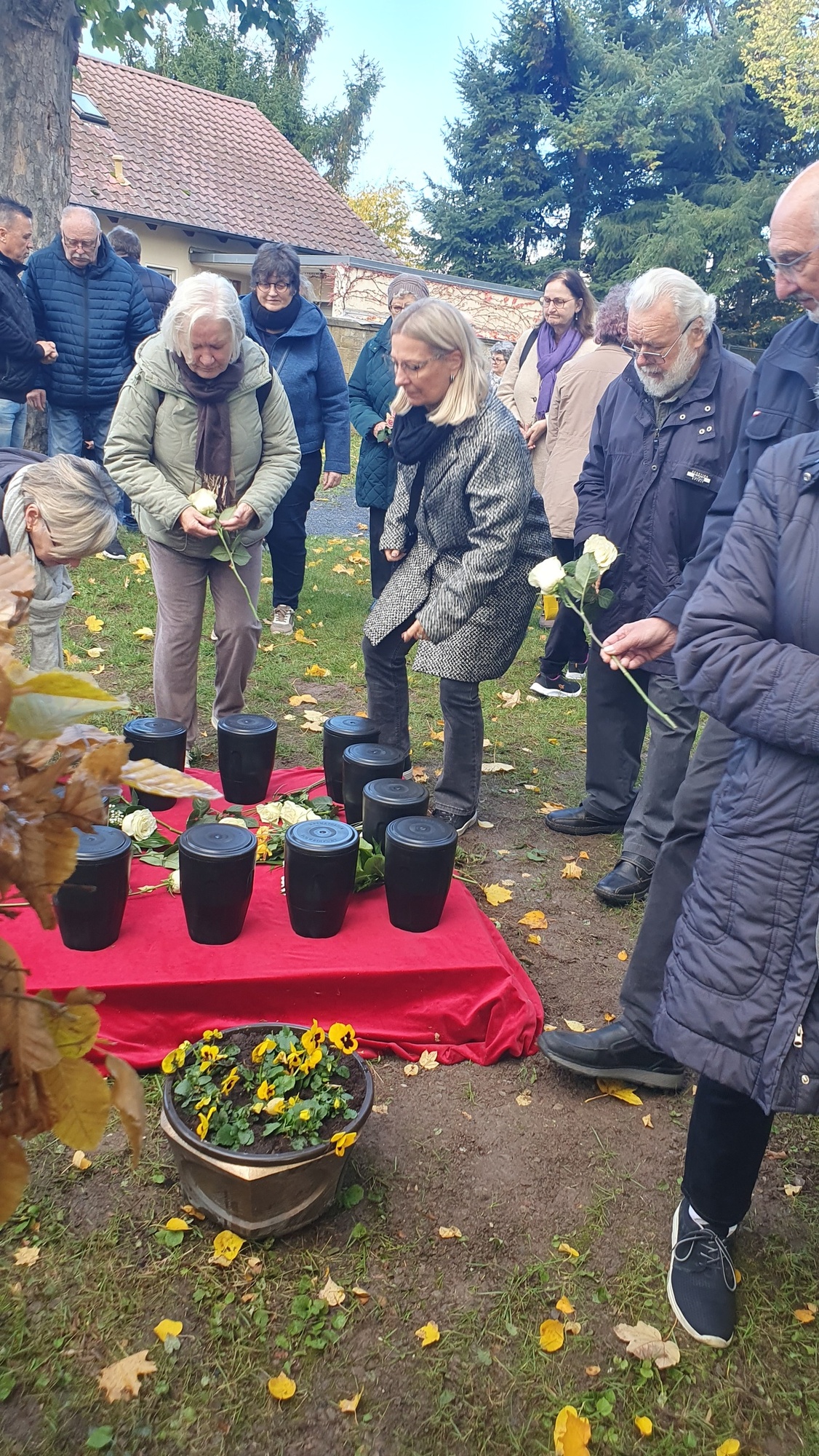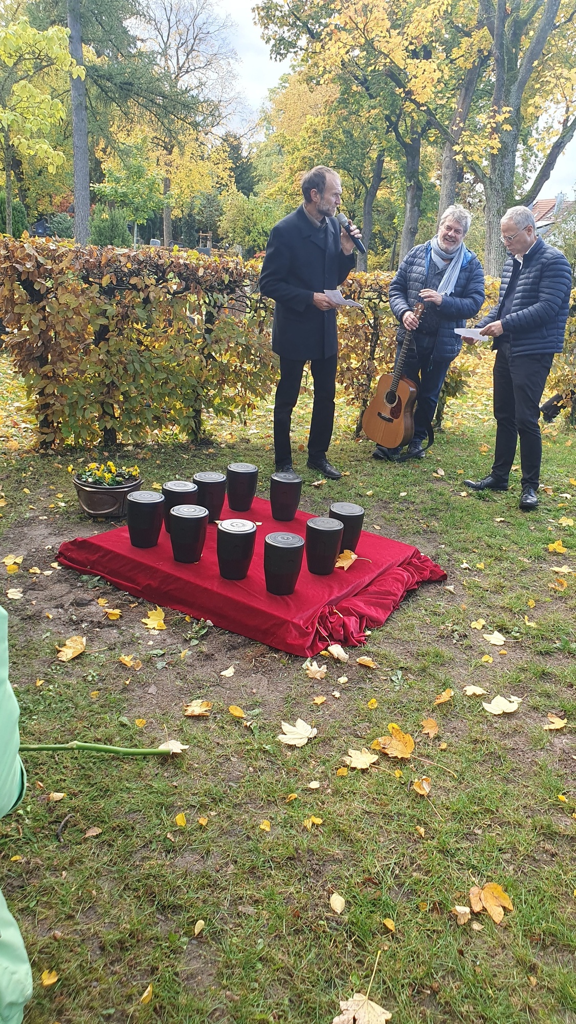 Am Ende tragen die Trauerden die Urnen zur letzten Ruhestätte. Jede Urne findet einen Träger. Ein stiller Zug formiert sich und zieht zum Grab am Ende des Friedhofs. Jetzt scheint die Sonne und buntes Herbstlaub erstrahlt. Auf rotem Tuch finden die Urnen Platz, daneben weiße Rosen. Letzte Worte spricht Joachim, Johannes begleitet Sabine auf seiner Gitarre. Die um das Grab Stehenden singen „Von guten Mächten“. Sie fühlen sich längst verbunden. „Das war die schönste Trauerfeier, die ich je erlebt habe“, flüstert eine weißhaarige Dame. „Danke, dass sie das machen für diese Menschen“, eine Jüngere. „Er war so allein im Leben, doch jetzt hat er noch so viel Würde erfahren“, eine deutlich ergriffene Frau“. Blätter segeln sanft vom Himmel. Still und getröstet gehen die Menschen zurück, hinein in ihren Alltag.