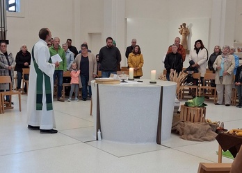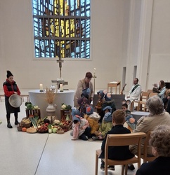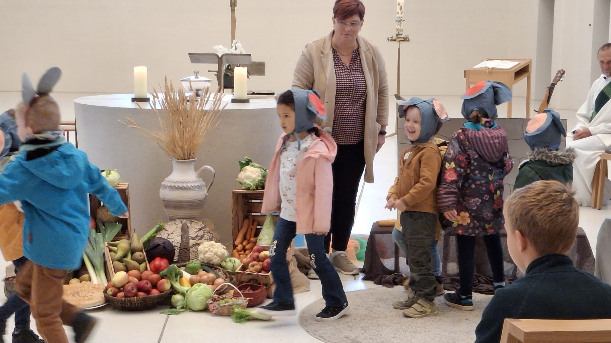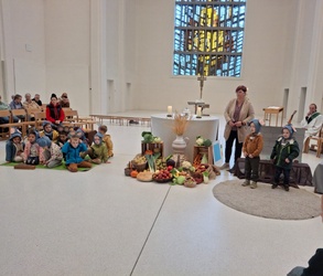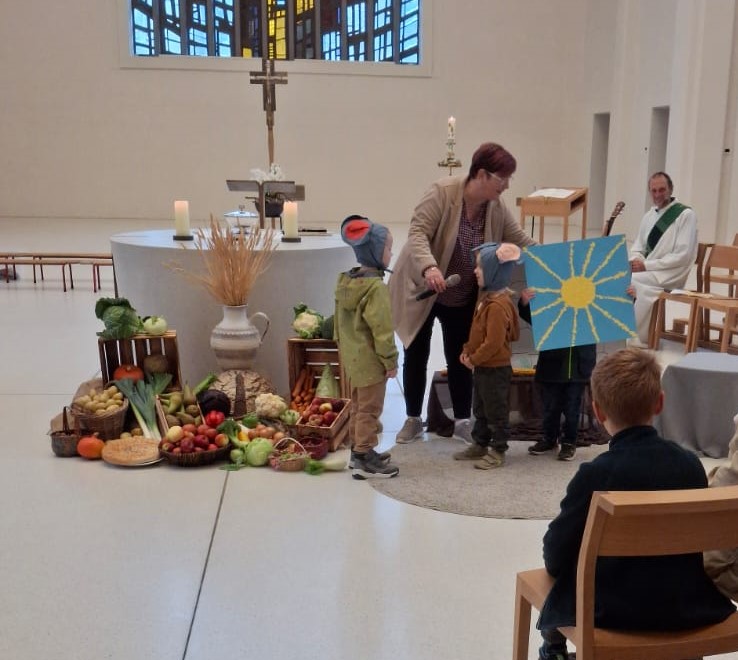 Das erzählte die Maus Frederik im Anspiel der Kindergartenkinder aus St. Anton im gut besuchten Erntedankgottesdienst am Sonntag, 06.10. in der eindrucksvoll gestalteten Kirche. Zunächst sticht da natürlich das imposante Arrangement der Erntegaben vor dem Altar ins Auge und sogar die Nase kann dem Besucher der Kirchenraums mitteilen, welches Fest da gefeiert wird und wurde. Dann kommen dazu noch die Steine, Früchte, Rückzugorte der Feldmäuse und natürlich die Sonnenstrahlen und Farben, die in der nachdenklich stimmenden Sammelaktion der Maus Frederik eine wichtige Rolle spielen. Gut vorbereitet durch die Erzieherinnen der KiTa (stellvertretend Karolin Schmidt und Claudia Günzel) ließen die Kinder die Geschichte der berühmten Maus lebendig werden. Das auch kleine, unscheinbare, ja fast unsichtbare Dinge eine wichtige, ja überlebenswichtige Rolle spielen, war die Grundbotschaft der Ansprache des Diakons Joachim Werb, der das Bildgleichnis vom kleinen Senfkorn für die Eltern, Großeltern und erwachsenen Gottesdienstbesucher deutete. Die winzige Saat (klein wie ein Senfkorn) ist ausgesät und in die Hände der Eltern gelegt. Jesus stärkt die Hoffnung, dass daraus etwas ganz Großes werden kann. Senfkorn und lebensspendender Baum stehen für den Glauben und die Lebenszuversicht, die es weiterzugeben gilt.